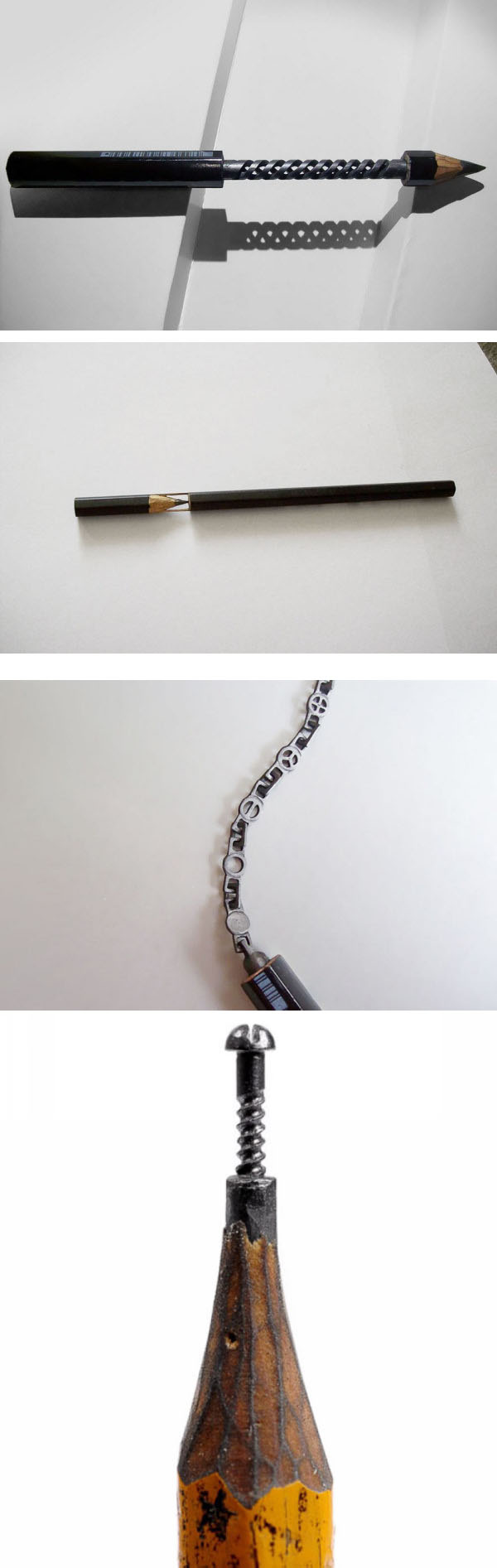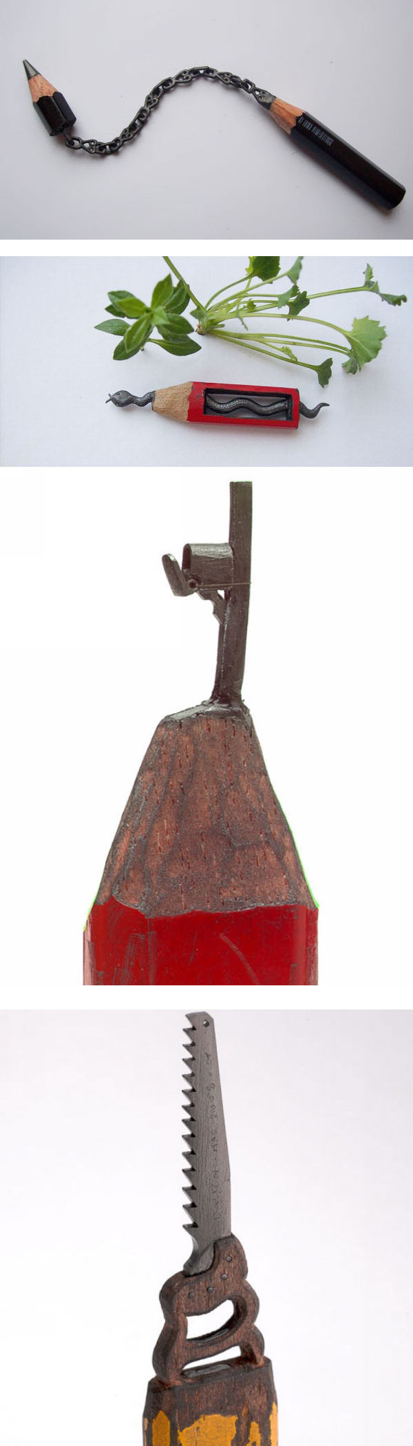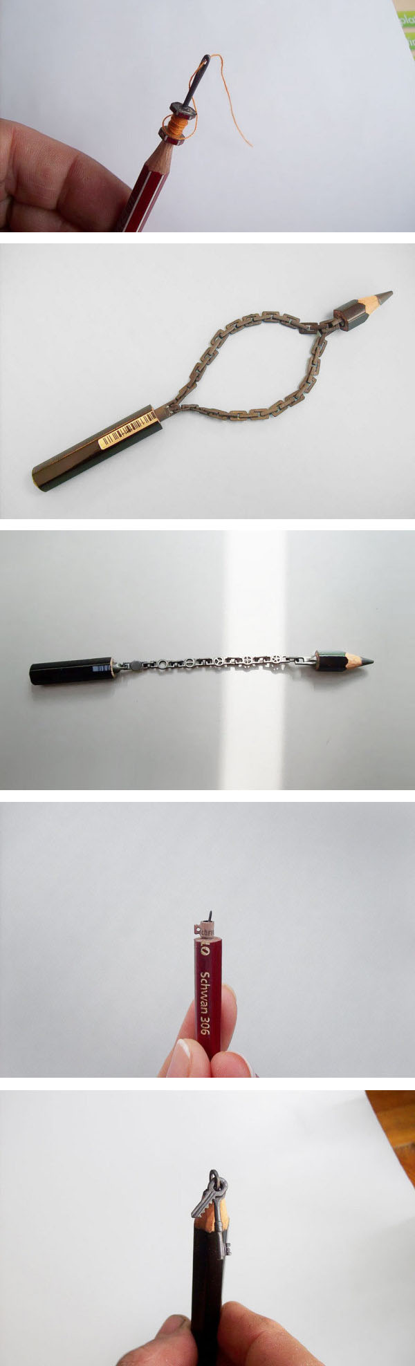 受到Dalton Ghetti的铅笔尖雕塑作品的影响和启发,匈牙利一名专业的工具制造商Cerkahegyzo也开始尝试动手雕刻铅笔芯,并将之作为放松身心的一种独特的方式。但就是这种对业余时间爱好的不懈坚持和投入,却愣是让Cerkahegyzo成了真材实料的艺术家 ,带来了许多繁复精巧的微雕作品 。艺术家会用到刀片、针、砂纸、锉刀和抛光石,以及各种各样的铅笔进行创作,当然,还有万不可缺的耐心与专注。作品名称:Cerkahegyzo的铅笔尖微雕作品 开开彩乐创意美术创意手工