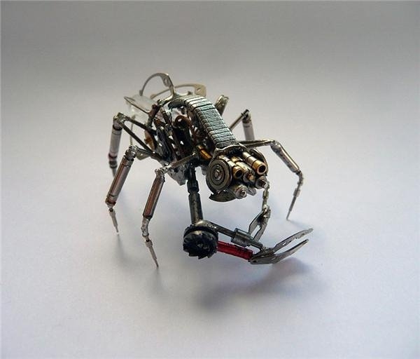 艺术家贾斯汀的祖父是铁路工人,爸爸是计算机迷。他从童年开始生活周围就被机械的东西包围着。长大了后,他仍然热爱将机械小零件拆卸,制作出新的东西非常迷人的。下面这些小蜘蛛、苍蝇、蝎子和螳螂等就是他的“机械”雕塑。